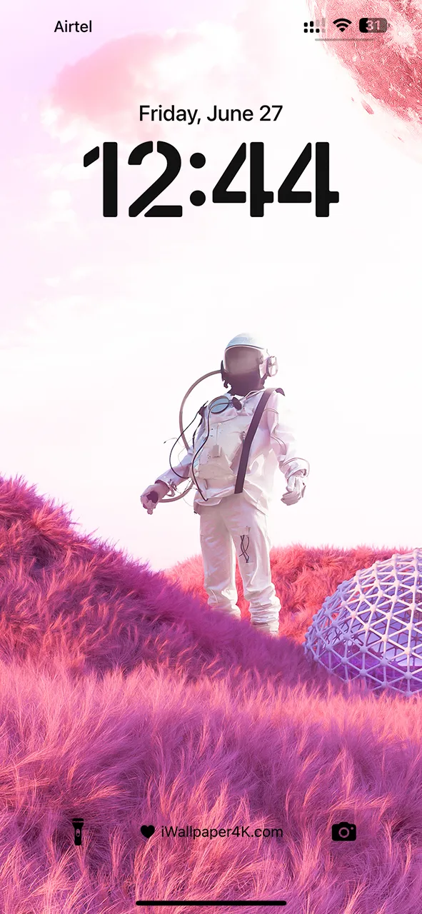 A white-suited astronaut walking on a surreal pink alien planet, surrounded by futuristic alien terrain.