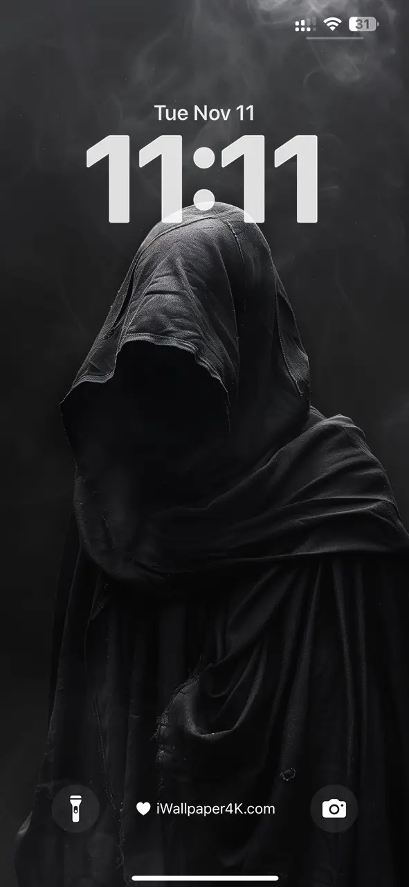 Mysterious wallpaper of a hooded figure in grayscale tones, surrounded by mist and shadows for a dark aesthetic.